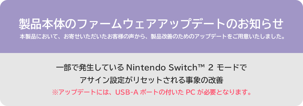 | 製品本体のファームウェアアップデートのお知らせ 本製品において、お寄せいただいたお客様の声から、製品改善のためのアップデートをご用意いたしました。 アップデート内容 一部で発生しているスイッチモードでアサイン設定がリセットされる事象の改善。 ※アップデートには、USB-Aポートの付いたPCが必要となります。 |