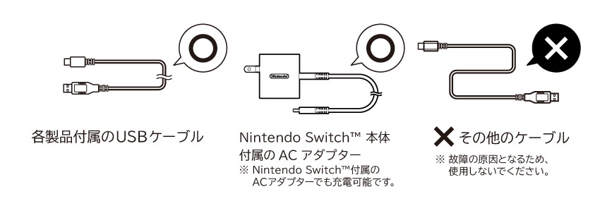 Nintendo Switch本体付属のACアダプター[HAC-002(JPN)]を直接製品に接続することで充電できます。