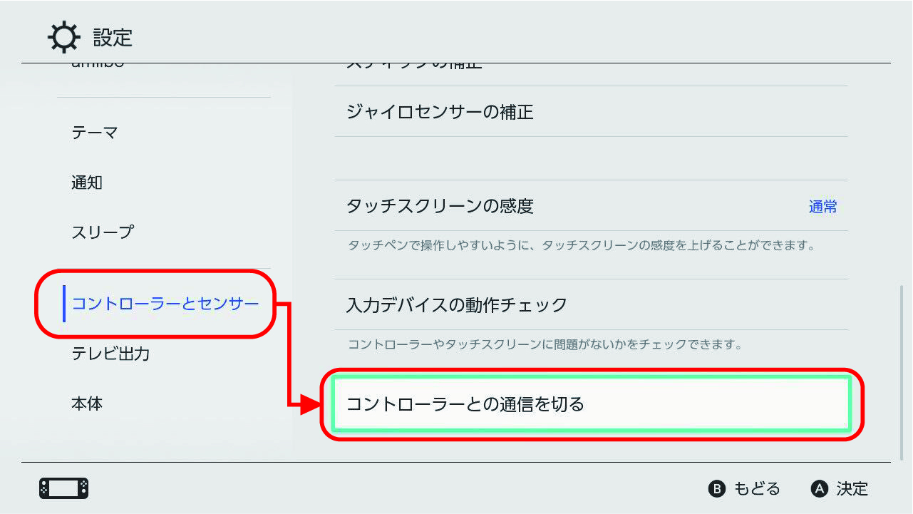 Nintendo Switch 本体のHOMEメニューから「設定」→「コントローラーとセンサー」→「コントローラーとの通信を切る」の順に選択してください。