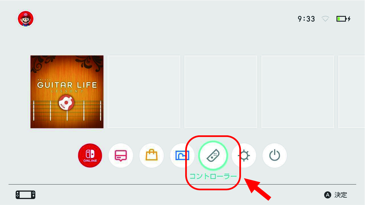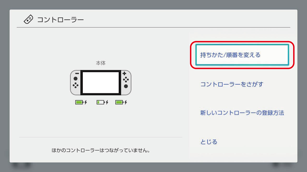 1. Nintendo Switch 本体のHOMEメニューから「コントローラー」→「持ちかた/順番を変える」の順に選択してください。