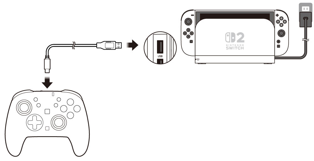 各製品に付属しているUSBケーブルをNintendo Switch 2 ドックに接続し充電を行ってください。