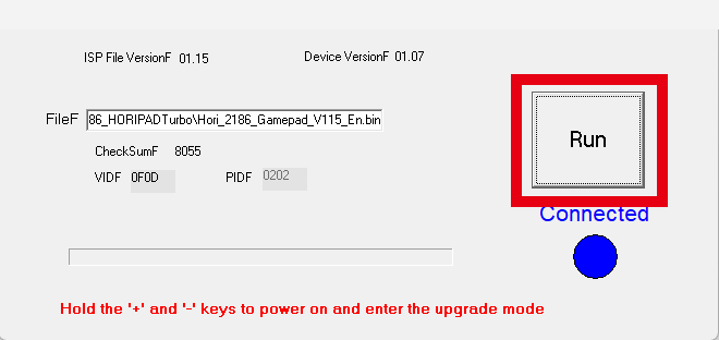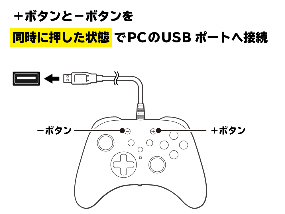 3. コントローラーの「+ボタン」と「-ボタン」を同時に押しながら、パソコンのUSBポートに接続をしてください。