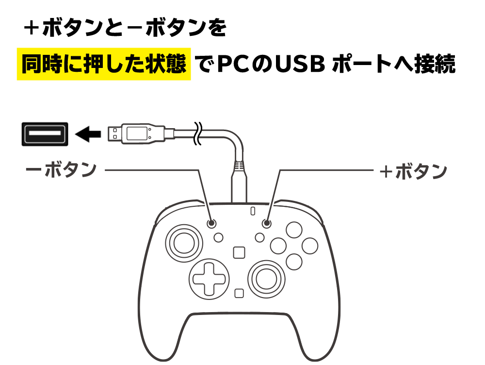 2. コントローラーの「+ボタン」と「-ボタン」を同時に押しながら、パソコンのUSBポートに接続をしてください。